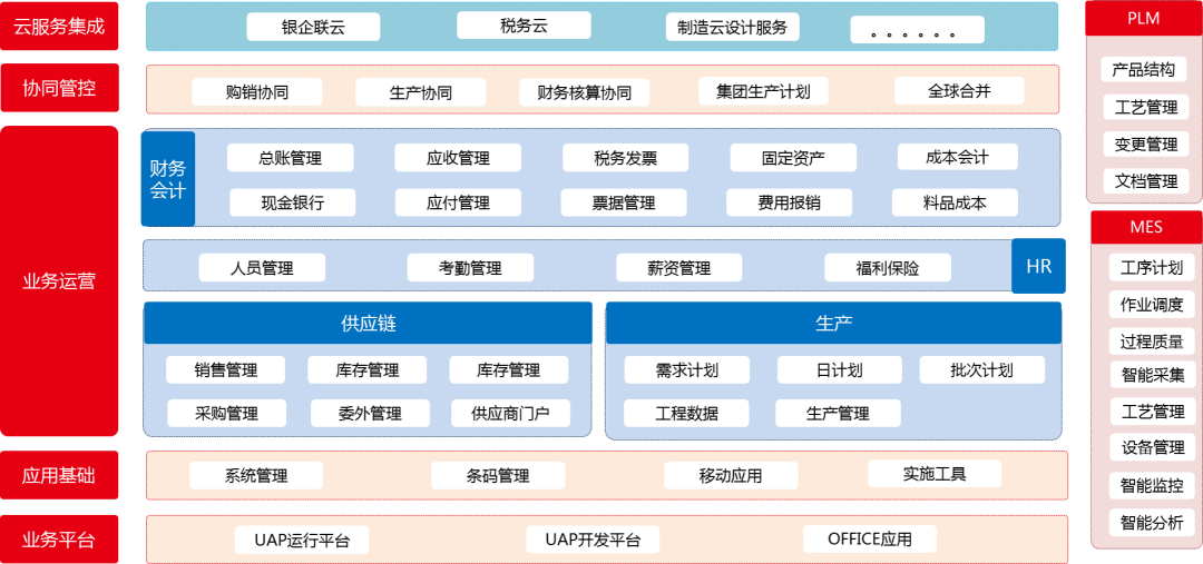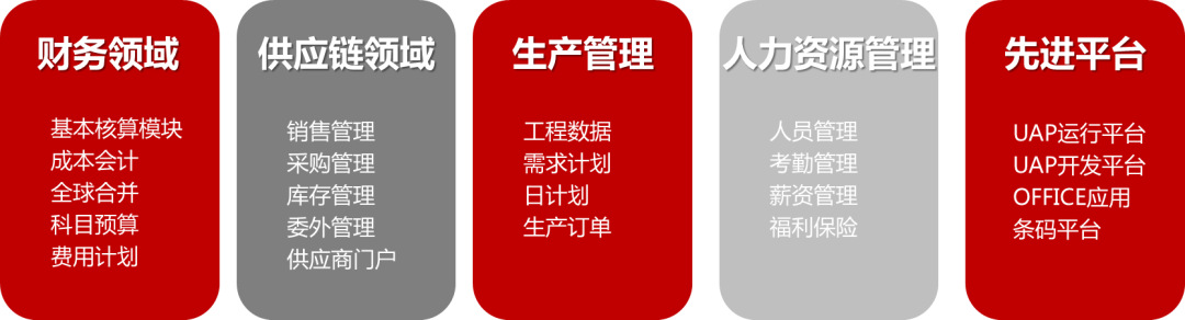 U9:企业日常经营活动管理,如财务、供应链、生产计划及成本管理