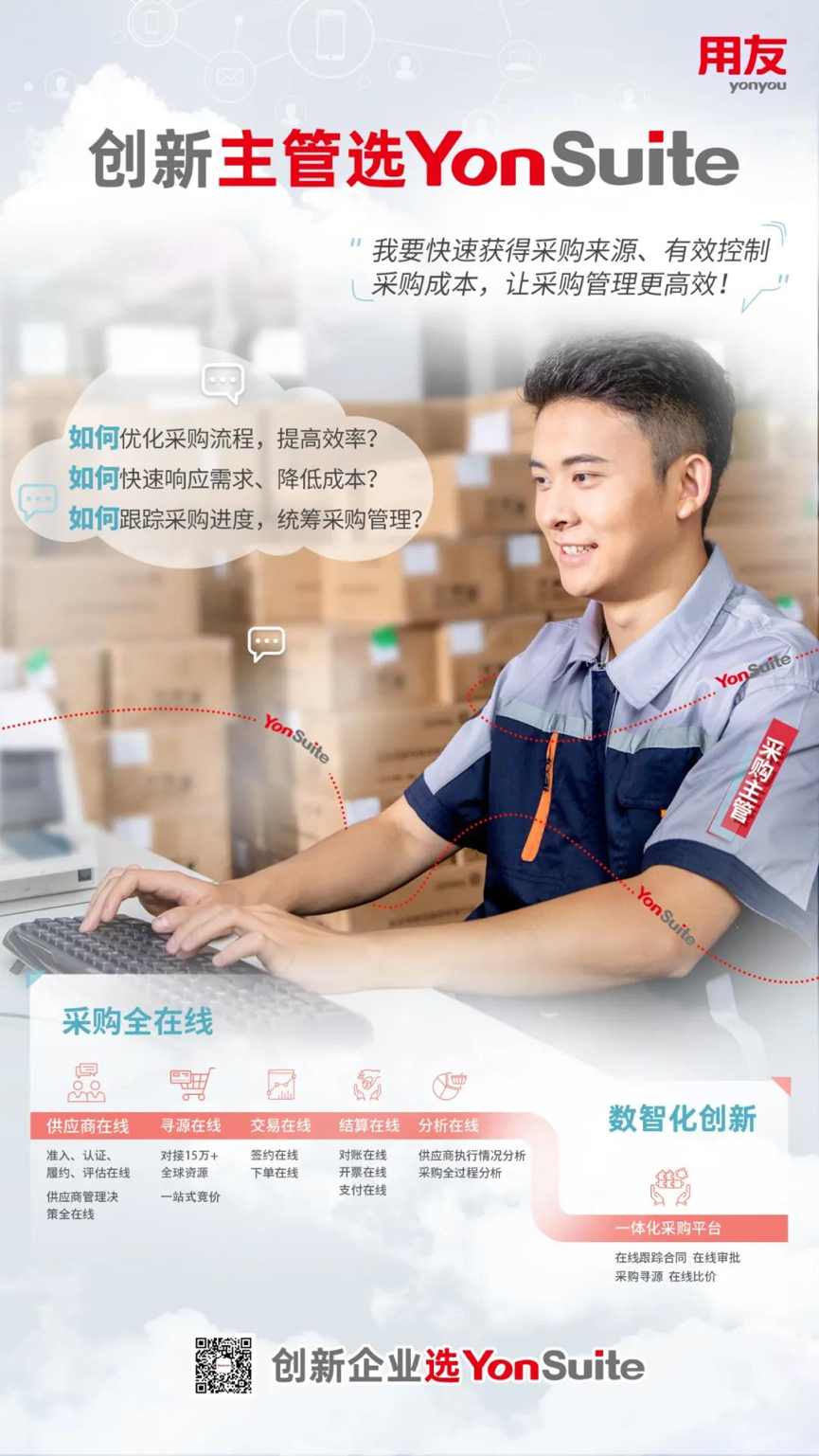 经调研,李明发现,用友YonSuite以“采购全在线”的一体化云服务平台,针对于采购过程中不同的角色和授权,通过供应商在线、寻源在线、交易在线、结算在线、分析在线,解决采购过程中成本管控难,采购过程不透明等核心痛点,并通过规范采购业务流程,进行合理的物资供应管理等手段,对采购过程进行全程管理、跟进和控制。这不正是解决了企业采购业务的棘手难题吗?