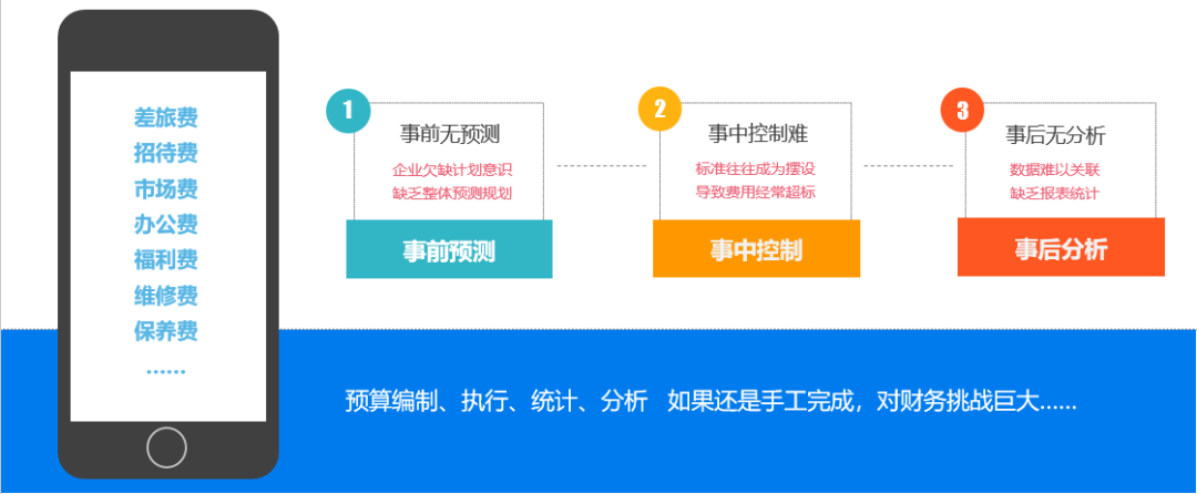 预算控制:采用人为的预算控制方式;无法得知当前人申请费用是否超预算;难以实现闭环管理。