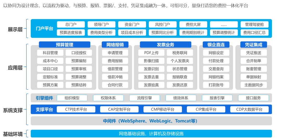 费控一体化是基于互联协同管理平台 ,以流程为驱动,预算、报销、票据、支付、总账,凭证集成,实现一体化的费控管理平台体系。