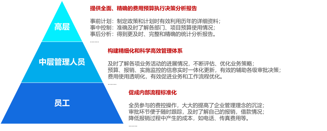 报销与预算合二为一,避免盲评和人情审批,做到真正的事前预测、事中控制、事后分析、提高资金使用率,减少坏账;