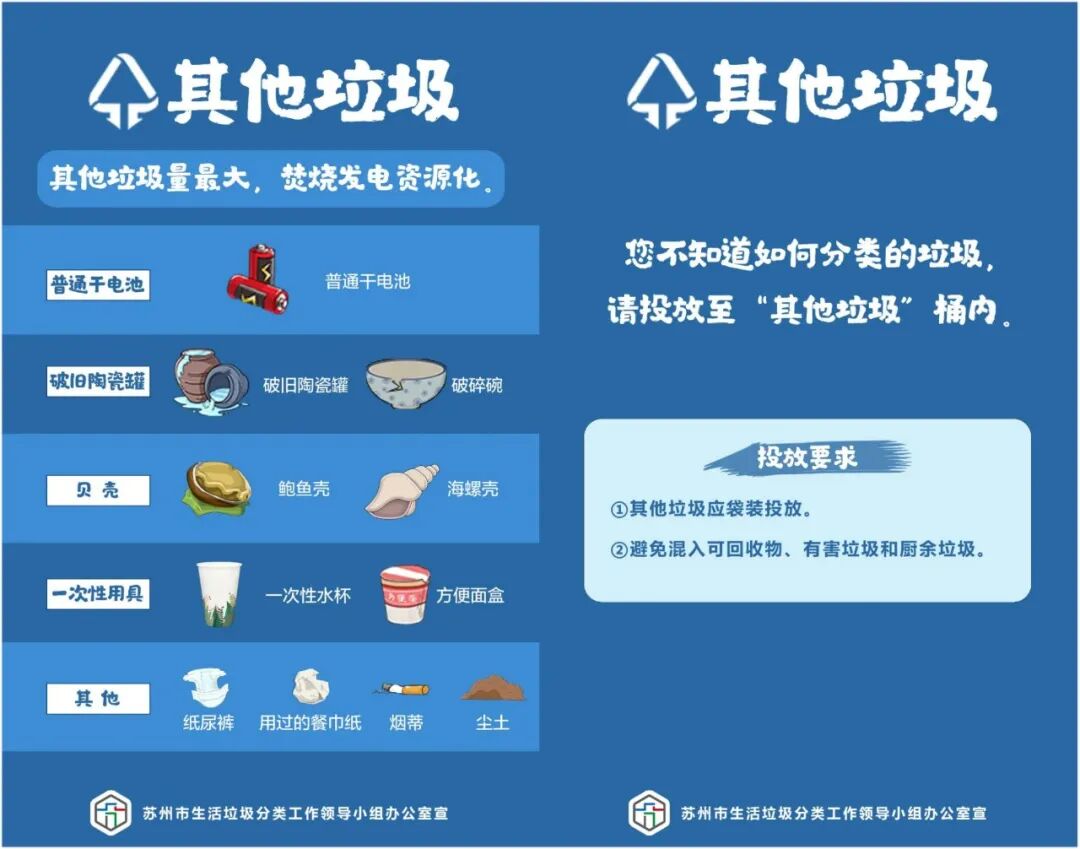 《苏州市生活垃圾分类管理条例》中规定,苏州市生活垃圾分为可回收物、有害垃圾、厨余垃圾、其他垃圾四类。